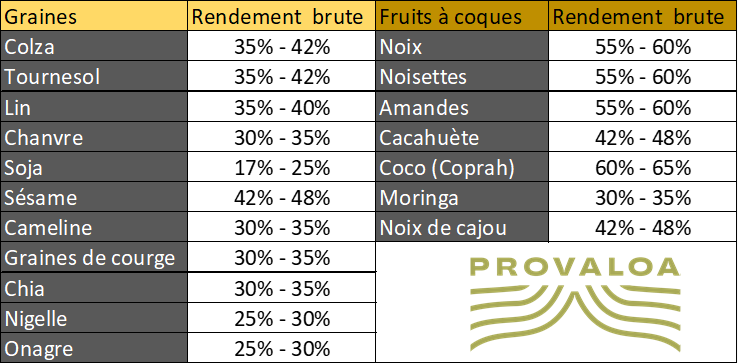 Les presses PROVALOA, c’est 30 ans de savoir-faire, nous avons réalisé de nombreux tests de rendement dans notre centre technique sur différentes matières premières, nos presses permettent d’obtenir les rendements les plus élevés sur le marché.